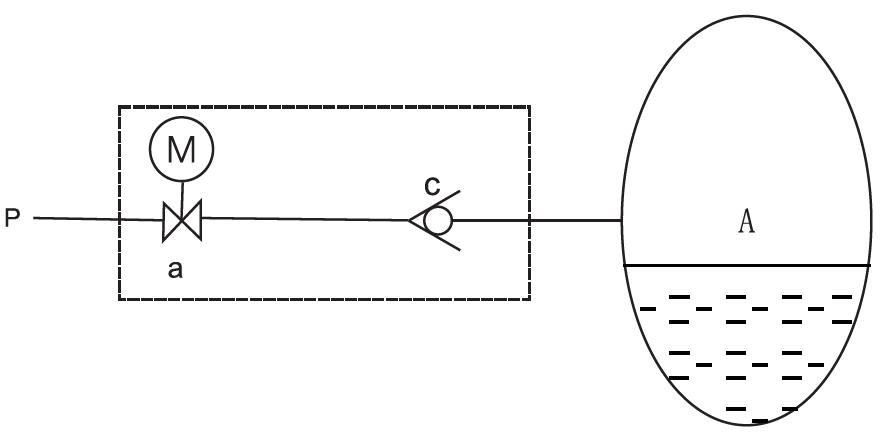 簡易型自動補氣裝置:工作原理如下圖所示,當自動補氣條件滿足時,電動球閥得令通電,高壓氣通過電動球閥a、單向閥c補氣。此時閥位指向開啟位置,同時位置開關(guān)輸出補氣信號。建議采用PLC間歇補氣,防止補氣過量。電動球閥帶手動裝置,失電時可實現(xiàn)手動操作。