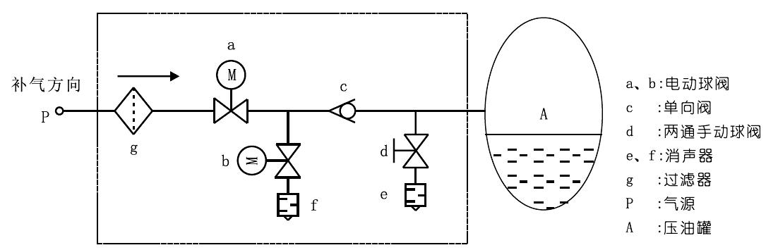 自動補氣:當自動補氣條件滿足時,關(guān)閉電動球閥b,打開電動球閥a,補氣過程:高壓氣氣源P→過濾器g→單向閥c→壓油灌A補氣。